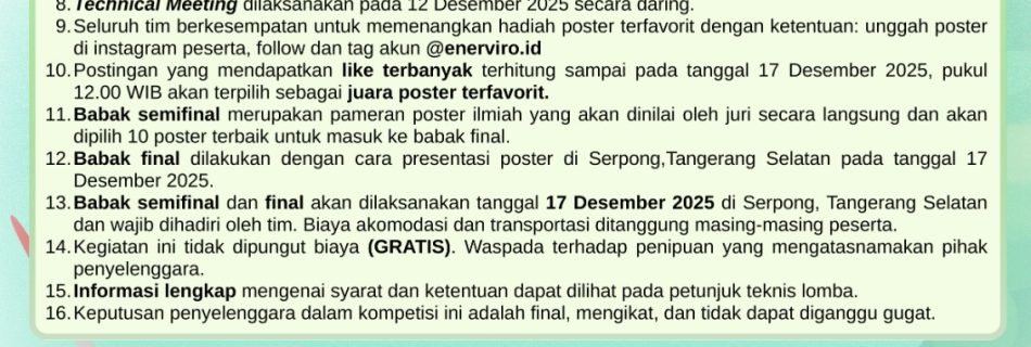 ⚡ LOMBA POSTER ILMIAH ENERGY WEEK 2025 ⚡ Hai, teman-teman kreatif! 👋 ⚡ LOMBA POSTER ILMIAH ENERGY WEEK 2025 ⚡Tema: 🌱 “TEKNOLOGI KONVERSI ENERGI UNTUK INDONESIA” Kegiatan Lomba Poster Ilmiah merupakan salah satu dari rangkaian acara Energy Week 2025 🎯 Siapa yang Bisa Ikut?* Mahasiswa/i aktif D-III, D-IV, atau S1 di seluruh Indonesia 💵 Biaya …